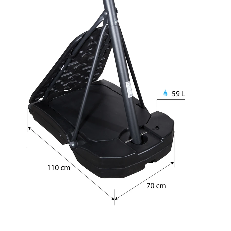 Масивна основа з розмірами 113 х 73 см заповнюється водою або піском до 59 кг, що гарантує надійну стійкість під час гри. У конструкцію вбудовано транспортні ролики, які спрощують переміщення стійки на нову локацію. Висота регулюється на п’яти рівнях з кроком 15 см, що дозволяє підібрати оптимальне положення для кожного гравця.