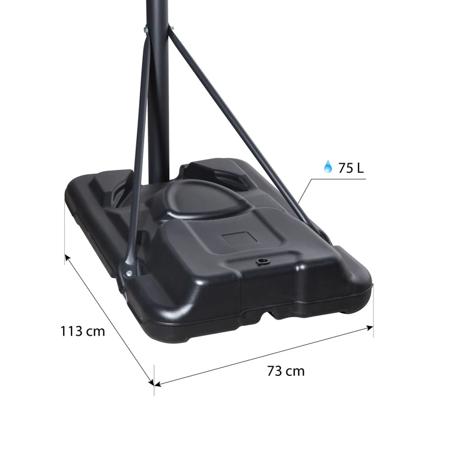 Система регулювання дозволяє змінювати висоту кільця на п’яти рівнях із кроком 15 см. Це дає можливість адаптувати стійку під зріст гравців та рівень складності. Основа розміром 113 х 73 см заповнюється водою до 75 літрів, забезпечуючи впевнене утримання конструкції на місці. Транспортні ролики дозволяють зручно переміщати стійку на потрібну локацію.