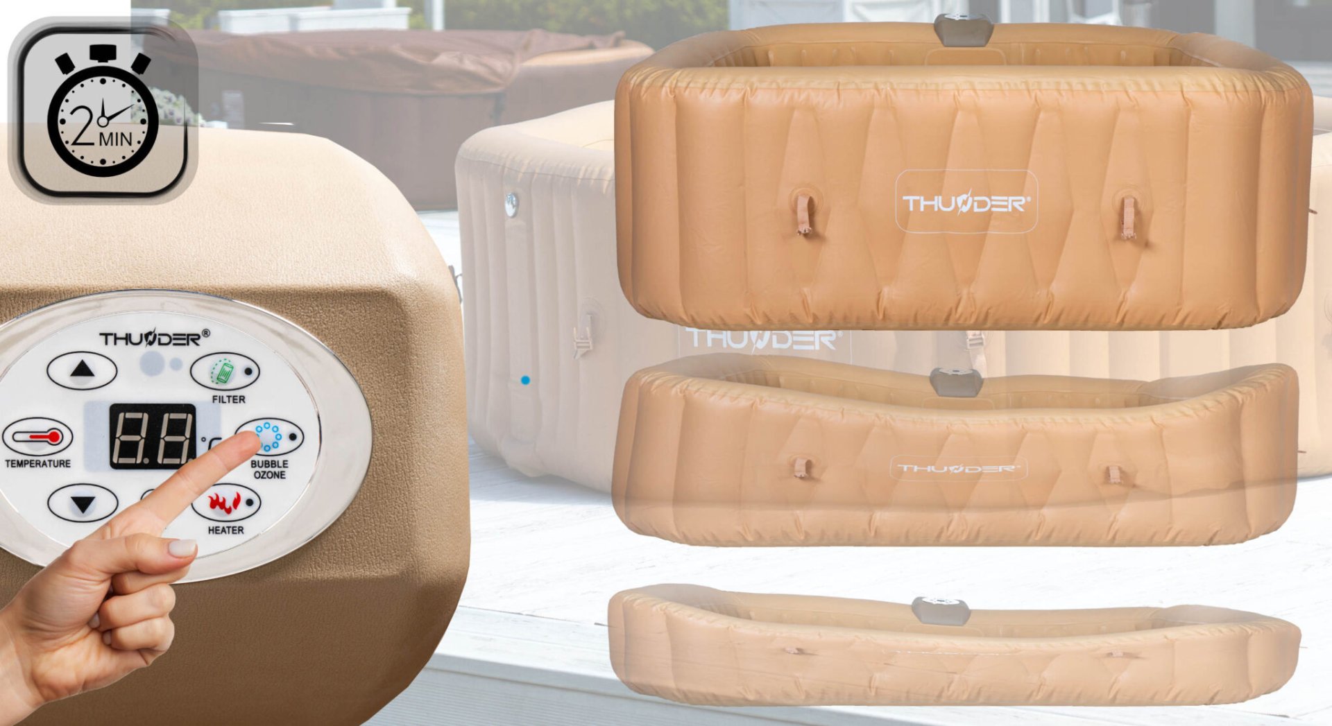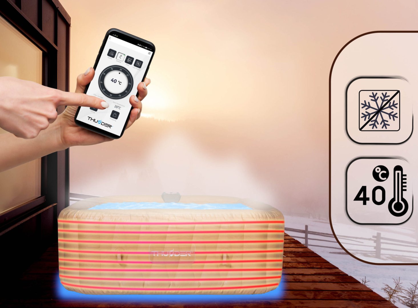 Тепла ванна, коли на вулиці мороз? А може, прохолодне підкріплення в спекотні дні? Усе це у вас під рукою з надувним джакузі THUNDER®️ FRAPPE . Використовуйте надувний джакузі, коли захочете, незалежно від погодних умов.