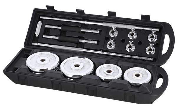 У комплект входять два коротких грифи, довгий гвинтовий гриф, шість затискачів і загалом 20 обтяжувальних дисків. Все це знаходиться в зручній валізі. Загальна вага комплекту становить 50 кг, тому для зручності транспортування валіза має колеса, що допомагає переміщатися з обладнанням.