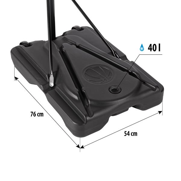 Основа стійки обладнана транспортними колесами, що дозволяє легко переміщати конструкцію з місця на місце. Для забезпечення максимальної стійкості, основу можна заповнити водою або піском - об’єм заповнення становить до 40 літрів. Такий підхід гарантує надійність і безпеку під час гри навіть на нерівній поверхні.