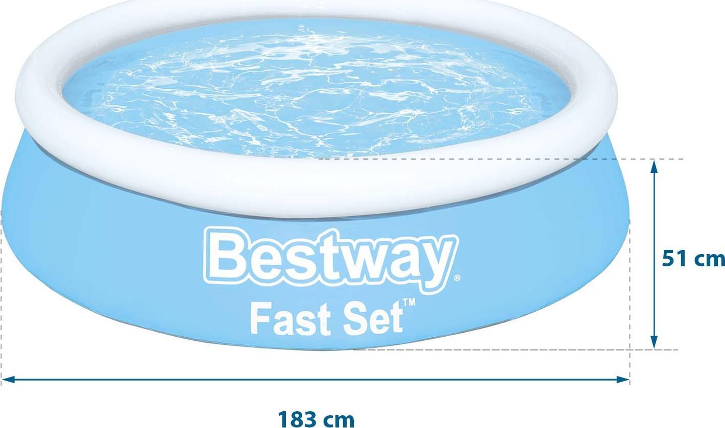 Ви можете в найкоротші терміни підготувати свій басейн Bestway Fast Set до використання протягом усього літа! Вам не знадобляться ніякі інструменти. Процес дуже простий - просто виберіть відповідне місце, бажано дуже рівну горизонтальну поверхню без коренів, каменів і т.д., надуйте верхнє кільце, і басейн буде підніматися, наповнюючись водою.