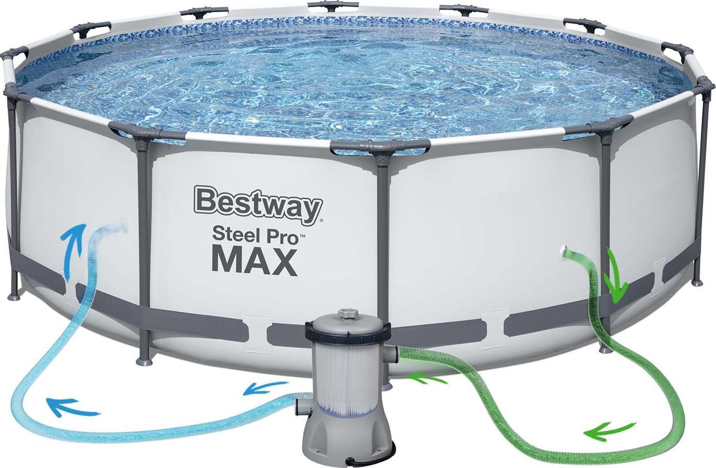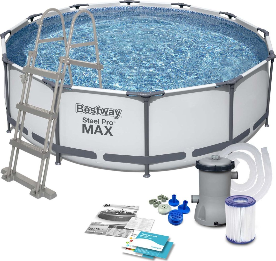 Басейн каркасний 10в1 Bestway Steel Pro Max 366 см (56418). Чаша виконана з високоякісного тришарового ПВХ: два шари щільного вінілу і один - поліестер для особливої міцності. Каркас металевий, нержавіючий, оцинкований.
