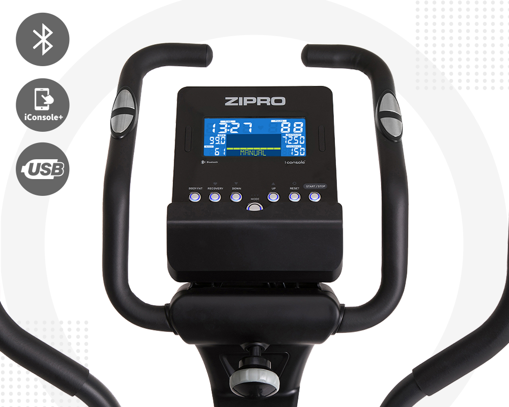 Еліптичний велосипед Dunk Zipro оснащений сучасним комп'ютером з екраном з блакитним підсвічуванням. Він працює з мобільним додатком iConsole+ і виконує точні вимірювання тренувальних даних. Він вимірює час тренування, швидкість, пройдену відстань, спалені калорії, оберти за хвилину (RPM) і записує пульс, виміряний сенсорними датчиками, розміщеними на ручках. Він також відображає поточну потужність (ват) і вибрану програму.