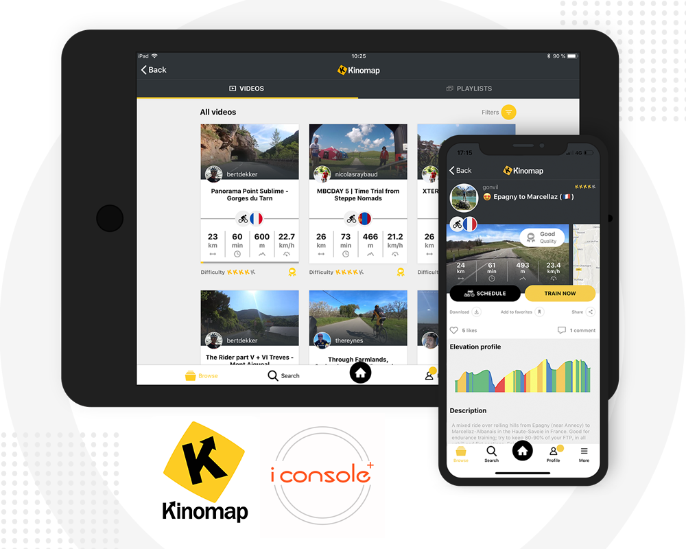 Через iConsole ви також можете тренуватися в додатку Kinomap - вибирайте відео з маршрутом і тренуйтеся! Слідкуйте за своїм прогресом і змагайтеся з іншими гравцями онлайн в реальному часі.