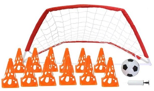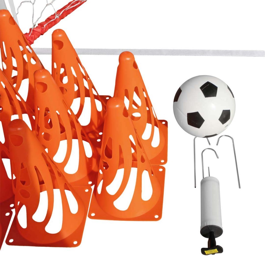 Разом із воротами ви отримаєте м’яч розміром 6 дюймів, ручний насос для накачування та набір із 12 тренувальних конусів. Такий набір дозволяє не лише грати, але й організовувати міні-тренування або вправи на спритність і точність ударів.