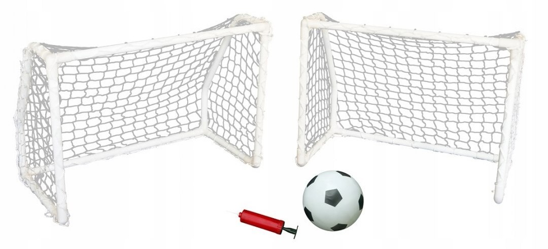 У комплект входять дві ворота з поліетиленовими сітками, м’яч, ручний насос і фіксатори для закріплення конструкції на ґрунті. Це дозволяє одразу починати гру без додаткових витрат чи пошуків аксесуарів.