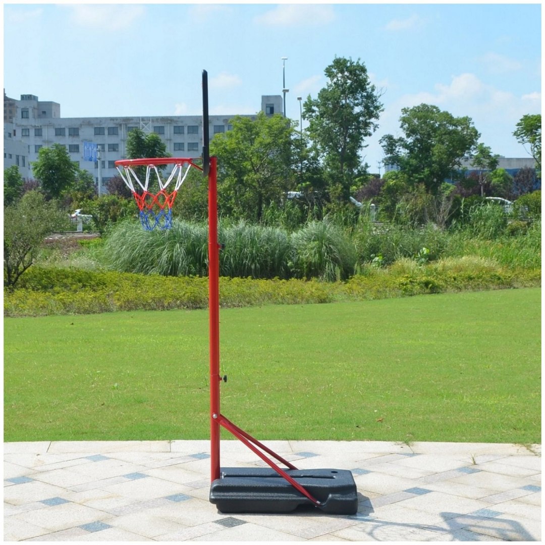 Стійка дозволяє змінювати висоту кільця у діапазоні від 105 до 165 см, що забезпечує адаптацію під зріст дитини та її рівень підготовки. Транспортні колеса, вбудовані в основу, дозволяють без зусиль переміщати конструкцію з місця на місце, а основа, яку можна заповнити водою або піском, гарантує надійну стійкість під час гри.