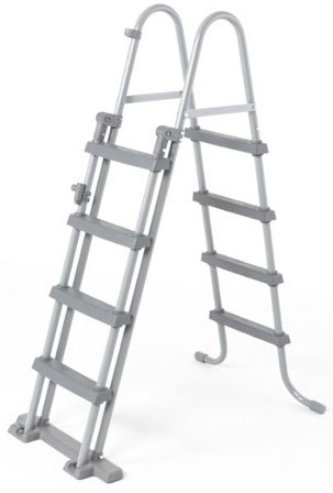 Вона дозволяє легко і безпечно входити і виходити з води. Представлена тут модель — це наземна драбина. Вона має 4 сходинки на зовнішній стороні, які міцно прикріплені до сталевої рами. Вона міцна і стійка до пошкоджень завдяки антикорозійному покриттю. Підходить для басейнів з максимальною висотою 1,22 м. Його перевагою також є швидкий і простий монтаж.