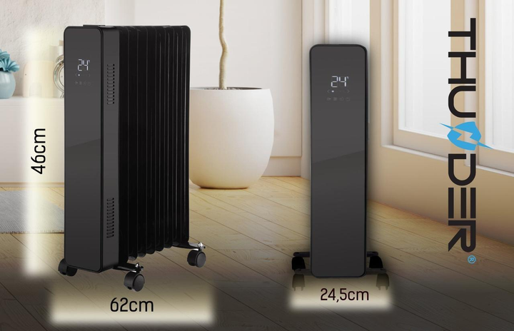 - Використання масляного обігрівача THUNDER абсолютно безпечне. Вбудований прецизійний термостат і його розширені функції дозволяють максимально точно регулювати температуру навколишнього середовища.