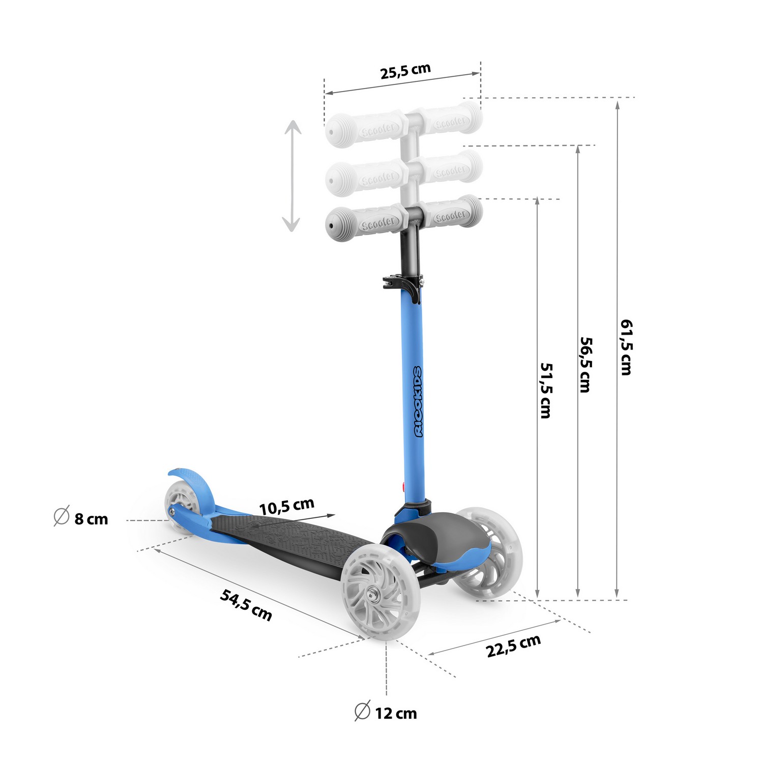 - Колеса: переднє PU 120 × 24 мм, заднє PU 80 × 24 мм, LED-підсвітка