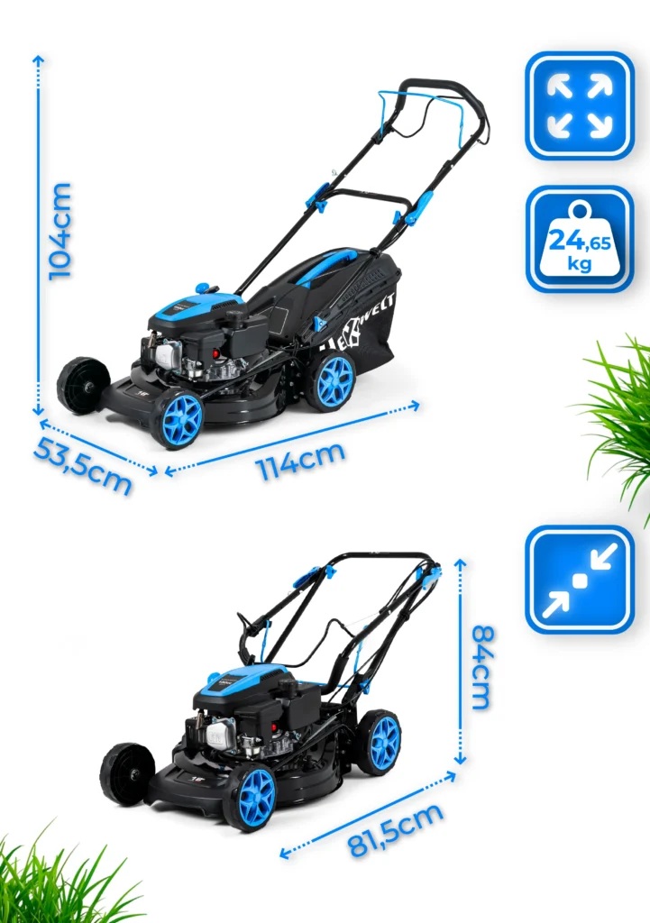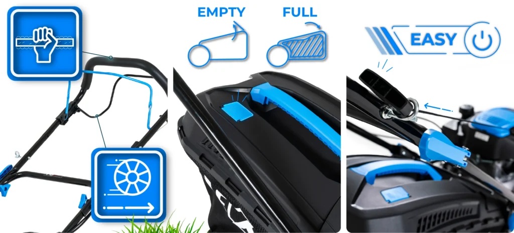 - 9 функцій в 1 - косіння, збір, мульчування, боковий викид, регулювання висоти зрізу, легкий запуск, порт для миття, привід, індикатор заповнення.