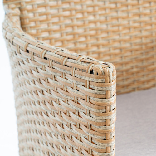 Комплект виготовлений із високоякісного поліетиленового ротанга, що плететься вручну, та посиленого сталевого каркаса. Завдяки цьому меблі не лише приємні на вигляд, а й стійкі до зовнішніх впливів. Загартоване скло товщиною 5 мм на стільниці гарантує довговічність та зручність у використанні. Всі елементи створені з урахуванням потреб користувача, забезпечуючи комфорт та довговічність.