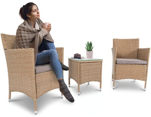 У комплект входять м’які подушки зі знімними чохлами, які легко прати. Ергономічні крісла забезпечують зручну посадку, а їхні габарити продумані до дрібниць: достатня глибина сидіння, оптимальна висота підлокітників та ніжок. Завдяки цьому ви можете повністю розслабитися на свіжому повітрі.