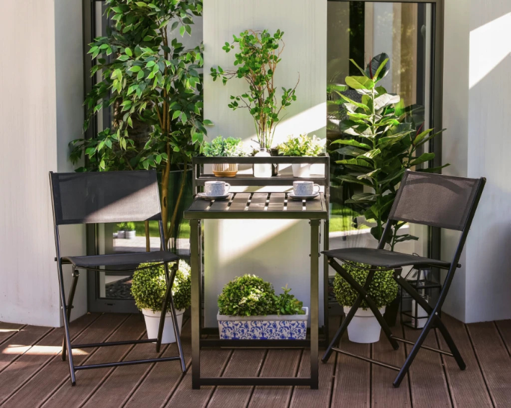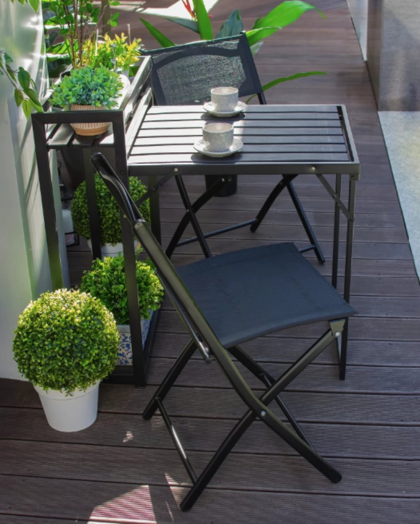 Завдяки розкладному механізму, набір меблів легко зберігати, коли він не використовується. У складеному вигляді стіл перетворюється на стильний стелаж, додаючи вашому балкону додаткову функціональність та естетику. Невеликі розміри комплекту дозволяють легко зберігати його поза сезоном, не займаючи багато місця. Це особливо важливо для тих, хто має обмежений простір для зберігання.