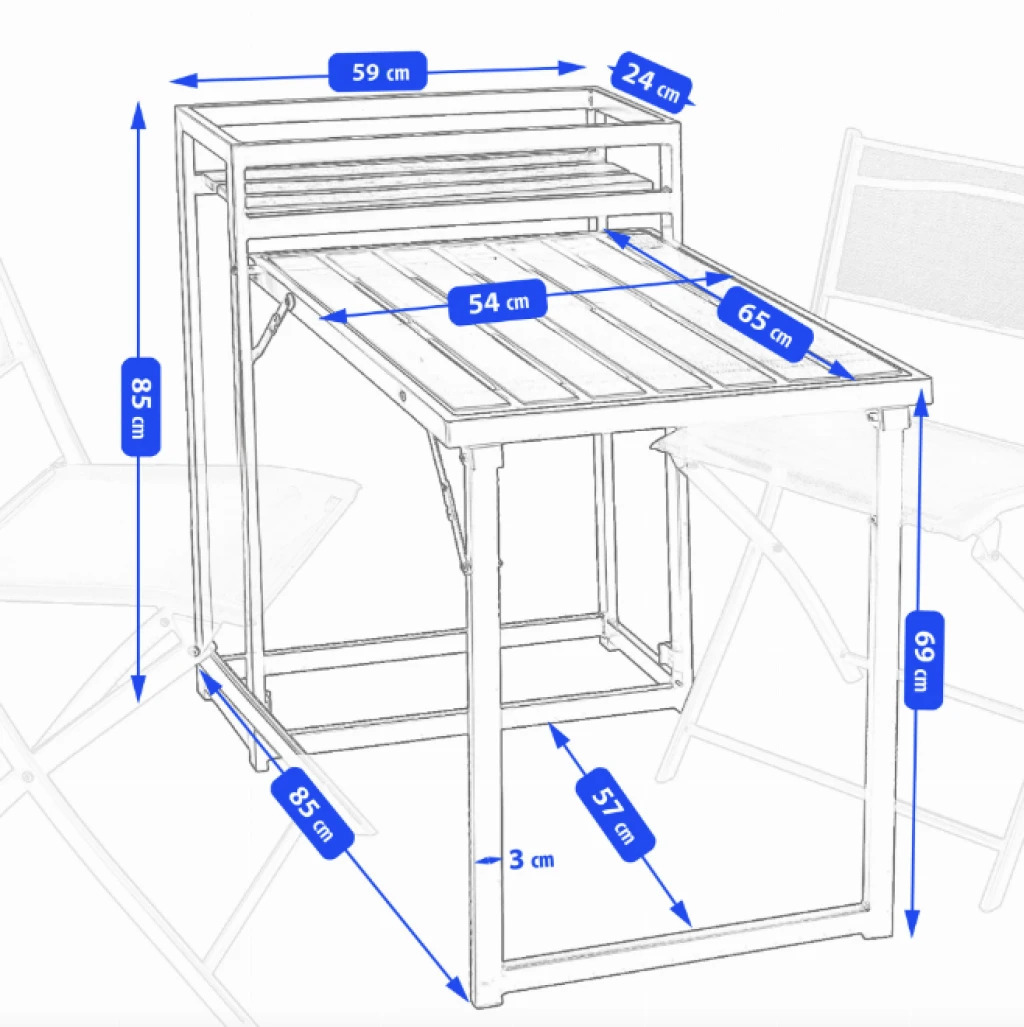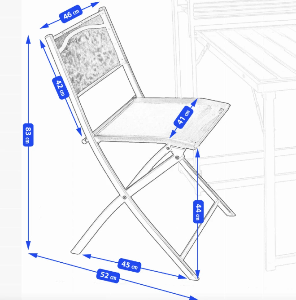 Крісла мають ідеальні розміри для вашого балкону: висота 83 см, ширина 46 см, глибина 52 см. Вони забезпечують комфортне сидіння навіть під час тривалого відпочинку, надаючи оптимальну підтримку спині. А стіл має висоту 85 см, ширину 59 см та глибину 85 см, що дозволяє зручно розмістити на ньому всі необхідні речі для вашого відпочинку чи обіду. Компактний, але місткий - ідеальне рішення для невеликого простору.