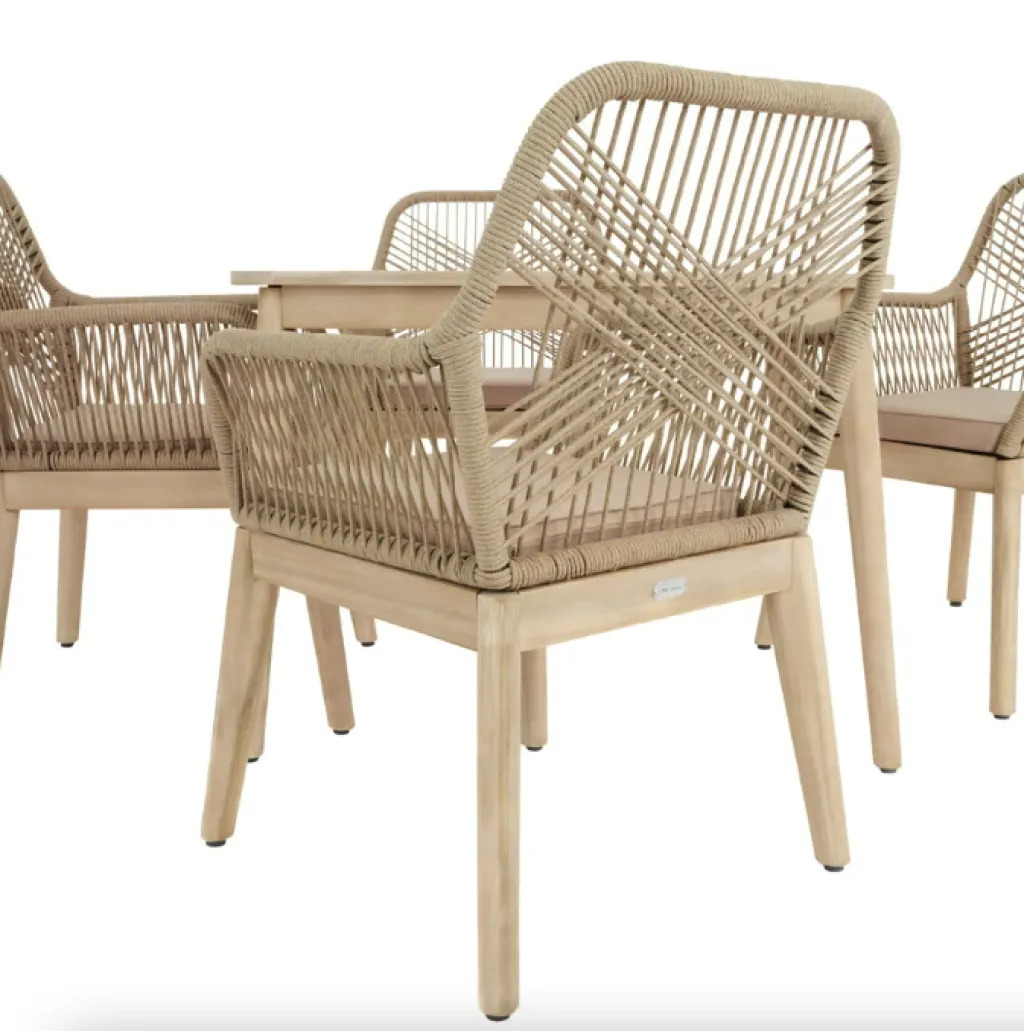 Каркас меблів для тераси виготовлені з високоякісного алюмінію - легкого, але водночас напрочуд міцного матеріалу. Він не піддається корозії, не боїться дощу, сонця та перепадів температур. Спинки та сидіння крісел обплетені товстою поліпропіленовою мотузкою (5 мм), яка зберігає форму, стійка до вологи й ультрафіолету. Усі дерев'яні елементи виготовлено з акації - цінної твердої породи, що славиться своєю довговічністю. Теплий натуральний відтінок додає меблям шляхетного вигляду та органічно вписується в будь-який природний ландшафт.