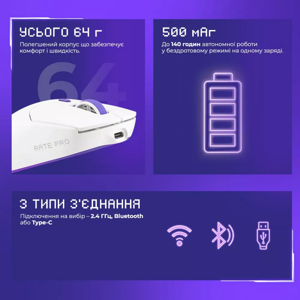 Час роботи. У моделі Proove Gaming Rate Pro автономність було доведено до максимуму. Миші вистачить на 140 годин безперервної гри, а повна зарядка вбудованого акумулятора ємністю 500 мАг займає всього 2 години.