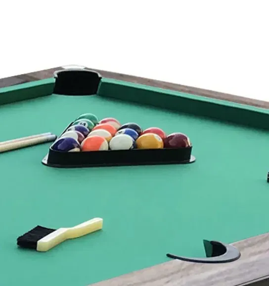 - Комплект аксесуарів для старту гри: до набору входять: кулі діаметром 57 мм (тип "Standard"), два дерев'яних кия довжиною 145 см, трикутник, дві крейди та щітка для догляду за полотном.