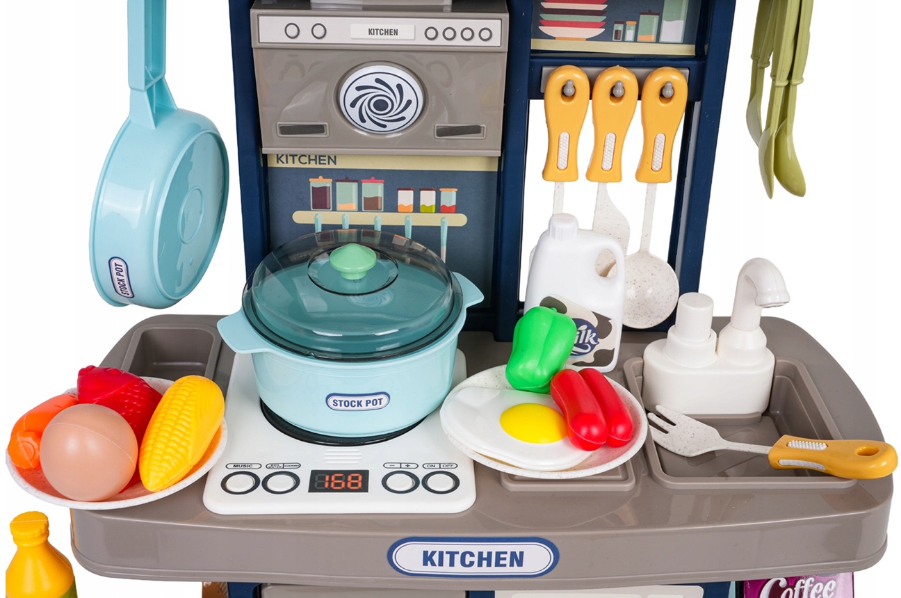 Дитяча інтерактивна кухня з функцією світла, звуку і краном, з якого витікає вода, а також безліччю аксесуарів, для дітей від трьох років. Кухня чудово виготовлена з пластику найвищої якості та має яскраві кольори, що заохочують дитину до гри. На стільниці кухні знаходиться інтерактивна панель зі звуками варіння, смаження та мелодіями, а також підсвічуванням. У комплекті також є макет духовки з відкриваними дверцятами та макет холодильника з відкриваними дверцятами. Іграшка працює від батарейок типу 3 x AA 1,5 В (не входять до комплекту).