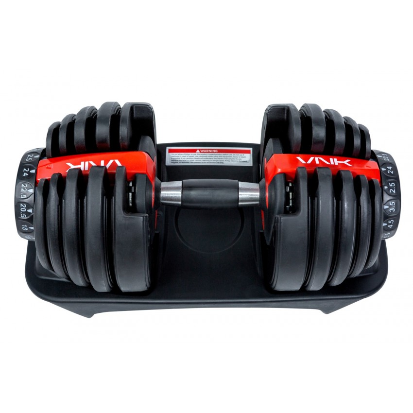 - Тепер Ви легко зможете повноцінно тренуватися навіть удома: пари регульованих гантелі VNK заміняють 15 пар традиційних гантелі. Вес одного снаряда варіюється від 2,5 до 24 кг. Для зміни ваги достатньо одного повороту циферблату.