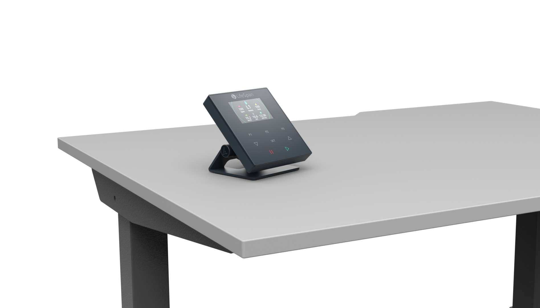 Консоль має розміри 20 см завдовжки, 14 см завширшки та 8 см заввишки, і її можна розмістити на будь-якому столі. Вона встановлена на зручній підставці, яка трохи нахиляється назад, що полегшує читання дисплея під будь-яким кутом. Білі літери на темному фоні також сприяють цьому. 3-сантиметровий дисплей чітко відображає дату, відстань, час тренування, калорії, кроки та швидкість. Консоль проста у використанні, тому ви можете миттєво ввести потрібні налаштування. Вона також має кнопки пам'яті, тому вам не доведеться повторно вводити потрібні налаштування наступного разу, коли ви захочете піти на прогулянку.