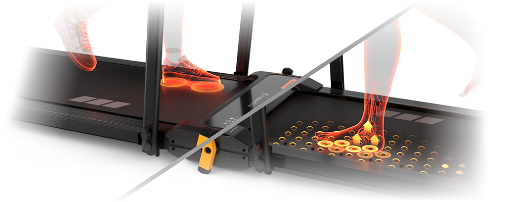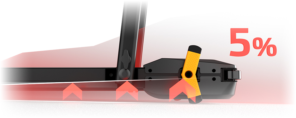 Бігова поверхня має природний нахил 5 % (2,9°) – що відповідає ходьбі по помірному схилу. Цей нахил не регулюється, але ідеально розроблений для імітації звичайного зовнішнього рельєфу та підтримки природного руху без перевантаження суглобів. Амортизація ударів забезпечує комфортну ходьбу та менш інтенсивне навантаження на коліна.