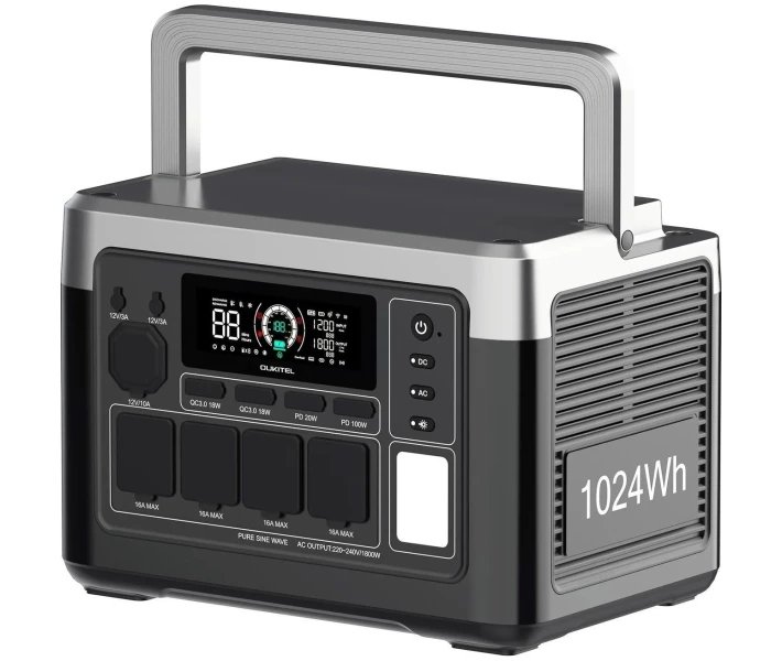 Oukitel P1000E Plus - портативна електростанція на акумуляторах LiFePO₄ ємністю 1024 Вт-год з інвертором чистої синусоїди 230 В і безперервною вихідною потужністю 1800 Вт (пікова до 3600 Вт) для живлення побутової електроніки та ІТ-обладнання. На панелі передбачено чотири розетки AC 230 В (EU), два порти USB-C Power Delivery (до 100 Вт і до 20 Вт) і два USB-A по 18 Вт; керування групами виходів та індикація вхідної/вихідної потужності реалізовані через фронтальний дисплей і кнопки, а також через мобільний застосунок із віддаленим контролем параметрів.