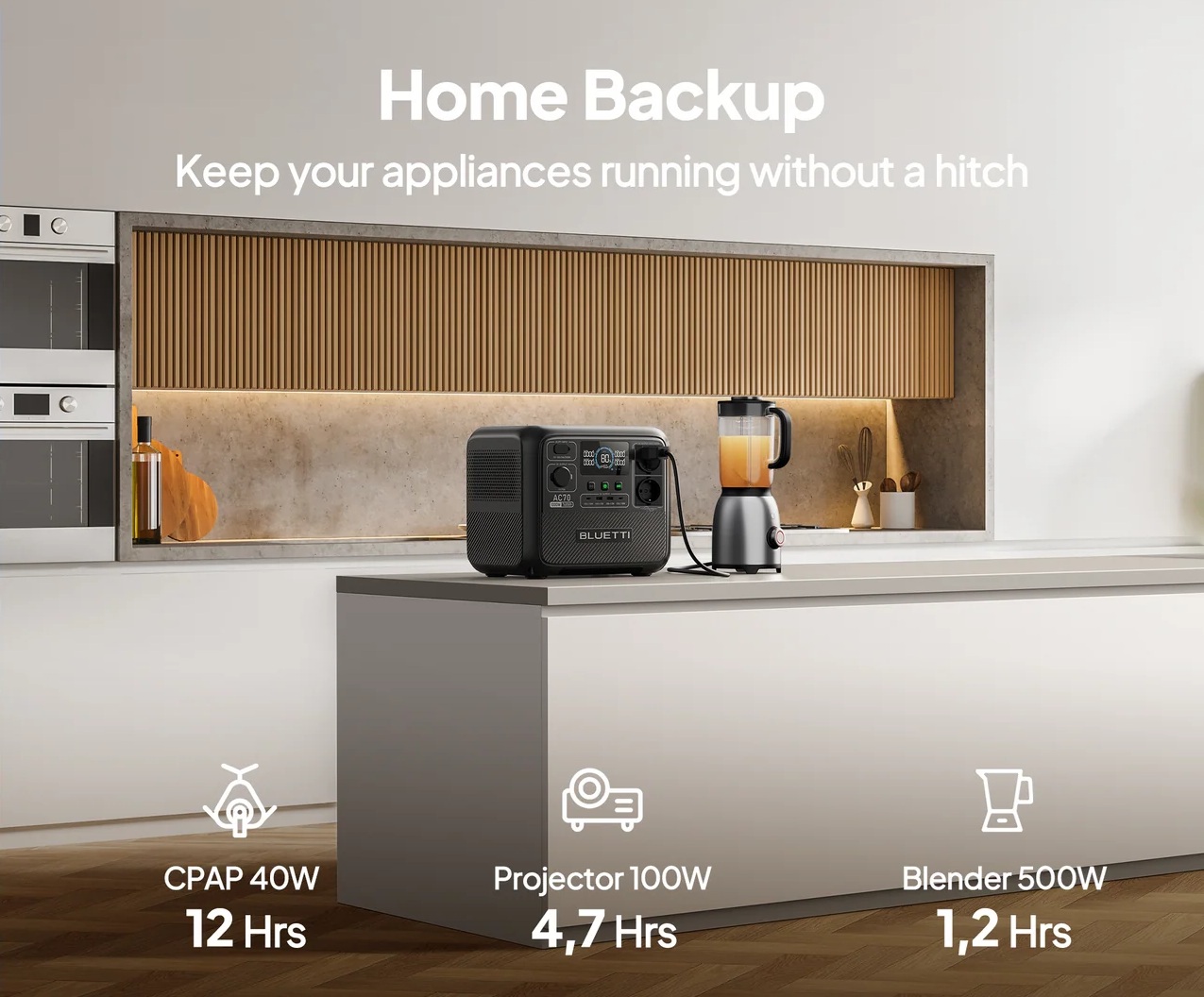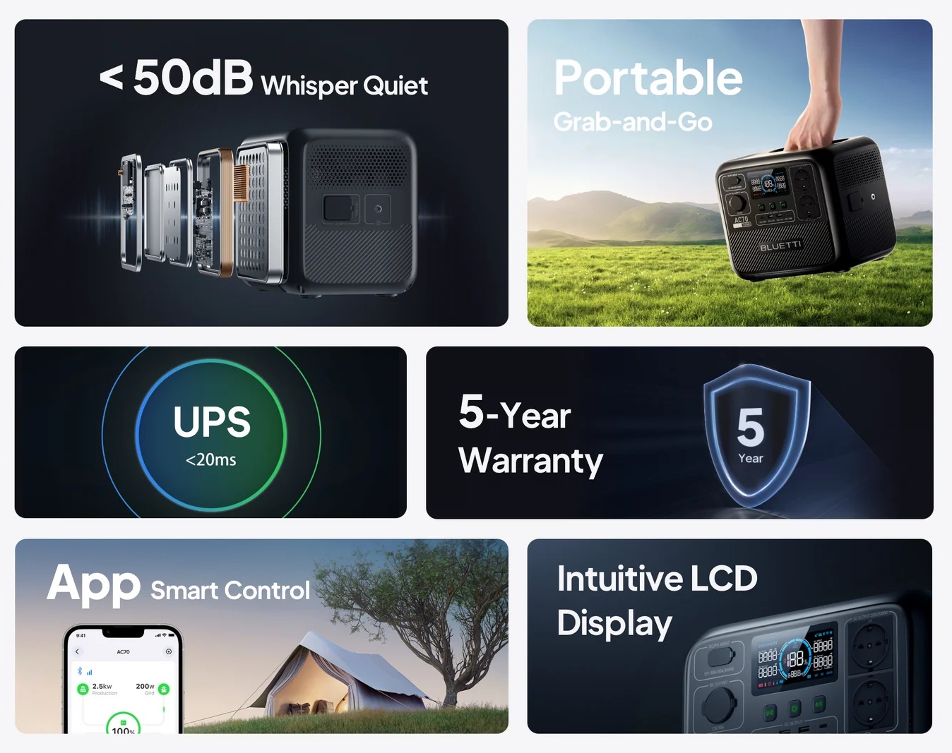 Зарядна станція BLUETTI AC70 - це компактне й універсальне рішення для забезпечення резервного живлення та заряджання безлічі пристроїв в умовах відсутності електрики. З ємністю 768 Вт-год і довговічною LiFePO4 батареєю (розрахованою на більш ніж 3000 циклів), вона гарантує надійне та безпечне живлення для домашніх приладів, електроніки та гаджетів.